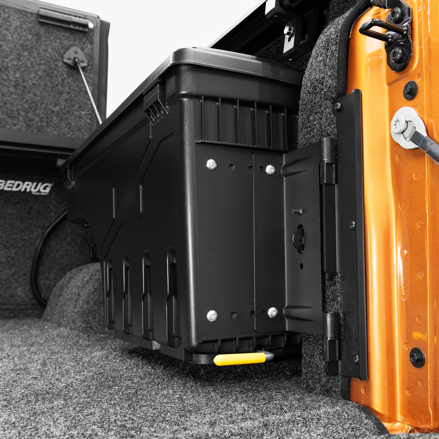 Crafted from durable composite materials, the Tub Locker Toolbox is built for strength and corrosion resistance. It mounts on heavy-duty steel hinges that let you swing the toolbox out over the tailgate, giving you quick and easy access to your gear.